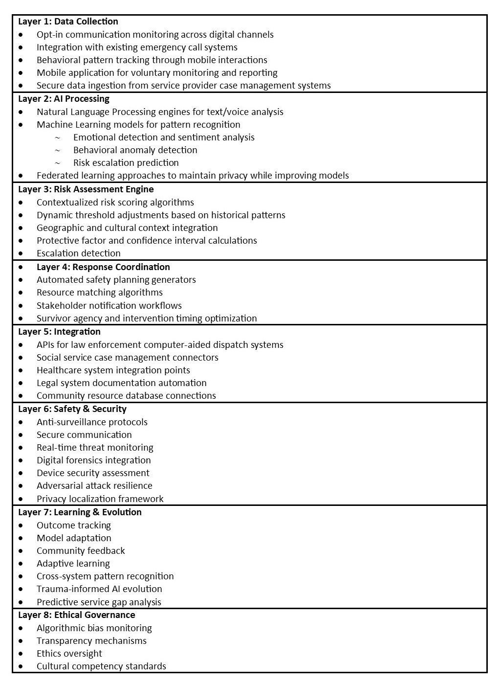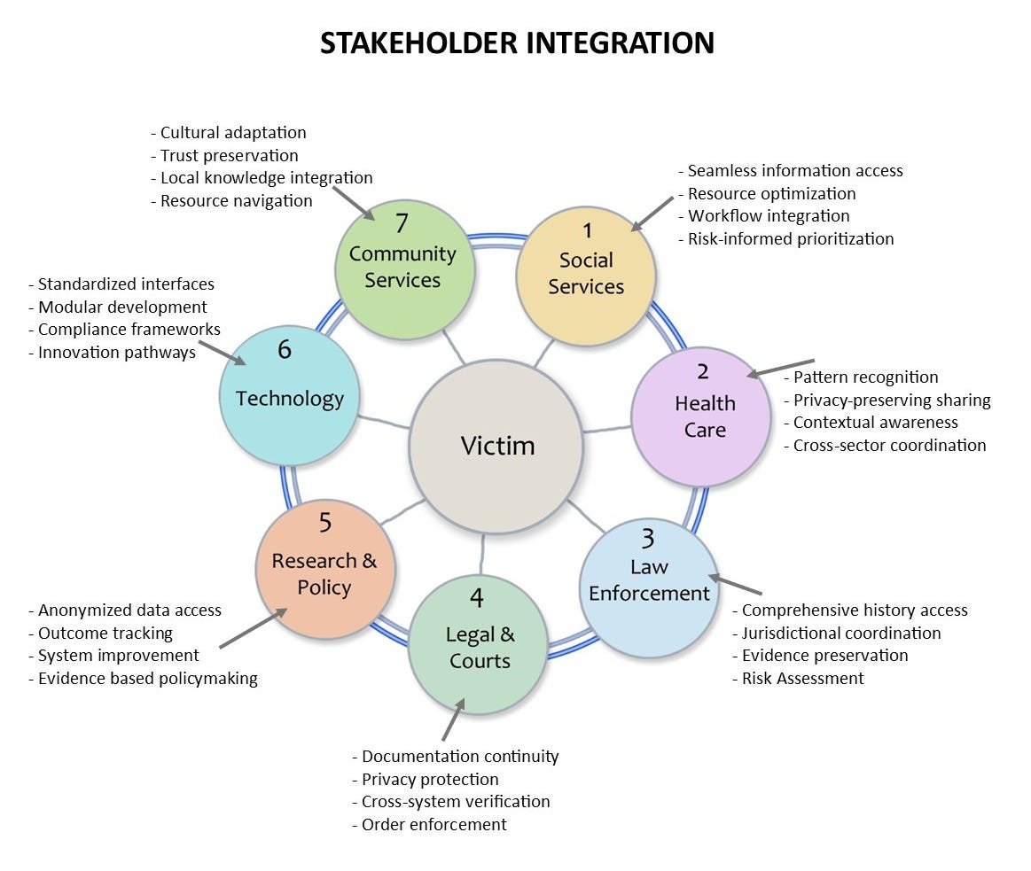 The system must be designed with clear integration points for all relevant stakeholders as described in the following graphic. Optimal stakeholder integration is a direct result of a well-planned, well-architected layered approach. When leveraging AI as a potential domestic violence remediator, each stakeholder group benefits from the cooperation and collaboration of this approach.
