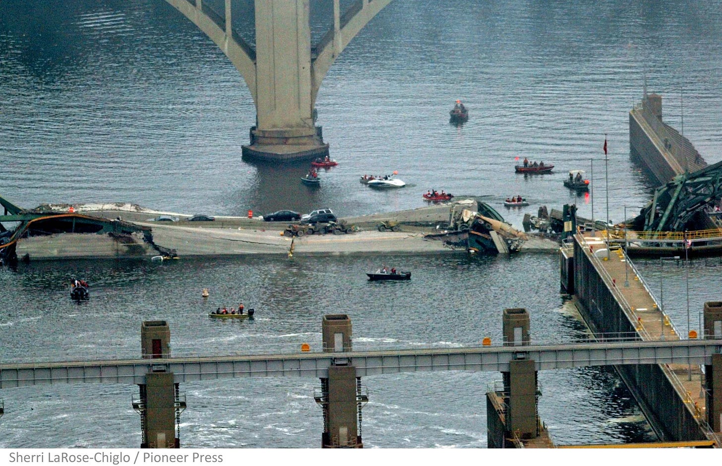 In his article at Pioneer Press, Nick Woltman reports, “The collapse of the I-35W bridge was one of the worst disasters in Minnesota history, killing 13 people and injuring another 145.” It occurred just after 6:00 p.m. on August 1, 2007. For those on the bridge, the plunge of 64 ft. into the river would have been a freefall into terror.